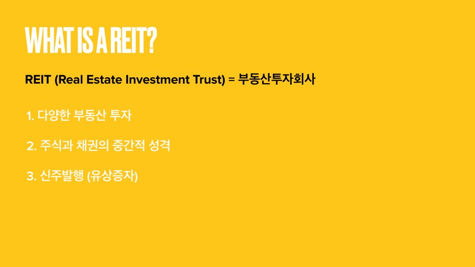 왜냐하면 리츠는 이익의 90% 이상을 배당을 해야 하기 때문에 내부의 많은 현금을 보유하기 힘듭니다.