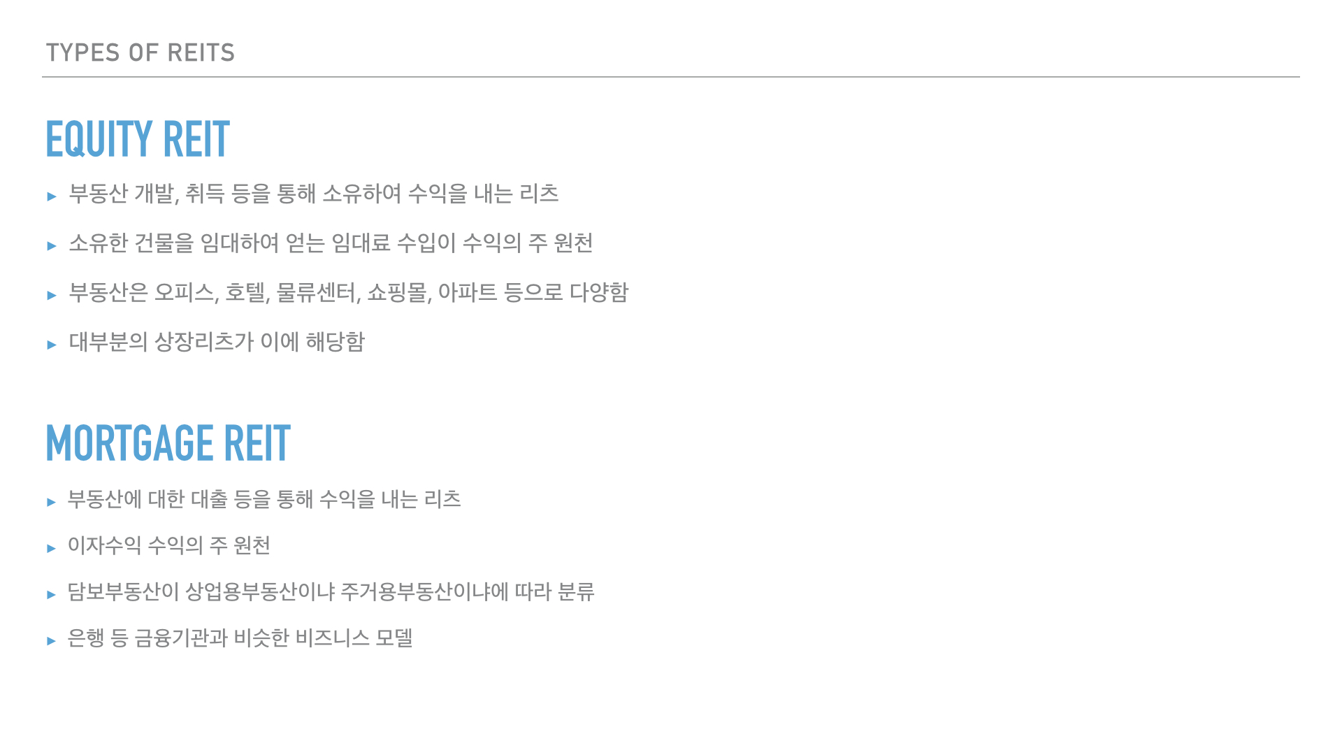 이상 미국 리츠를 크게 Equity 리츠와 Mortgage 리츠로 분류하여