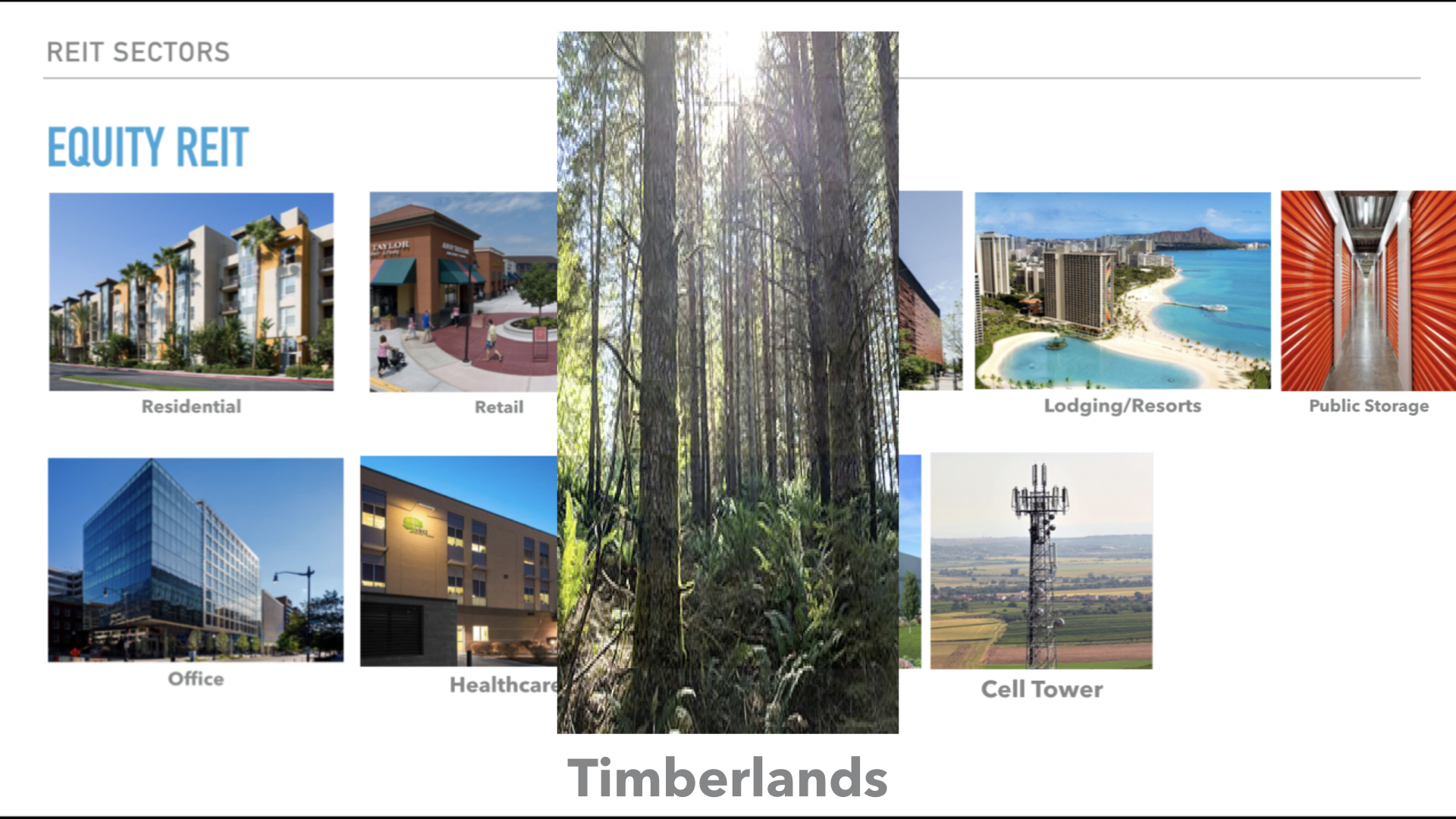다음으로 토지에서 나무를 재배하여 목재를 팔아 수익을 내는 삼림지 리츠가 있습니다.
